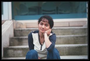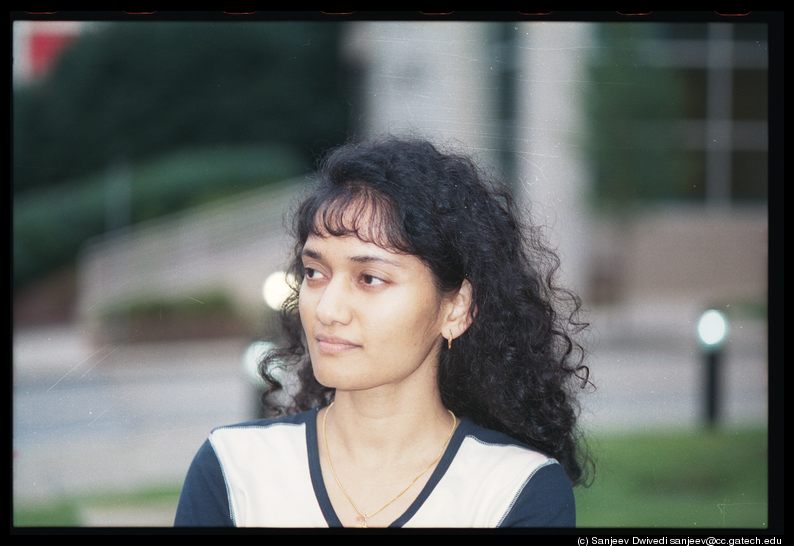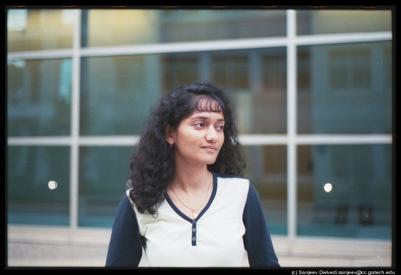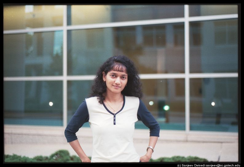 Minaxi Gupta, she is a fellow student, It was a dark overcast day (perfect for taking pictures) and it was also a friday. I was not up to doing anything and was lurking in the shadows with my camera at the ready for taking pictures. Minaxi was also not feeling like working so we went outside our office to take some pictures. She has this misconception that she looks horrible in pictures and I wanted to convince her that "there are no bad subjects, only bad photographers". I took quite a few number of pictures (~15) and I thought that most of them turned out pretty well. She however thinks that they look just ok. Well, since then I have come to realize that what looks good and what does not is extremely subjective.