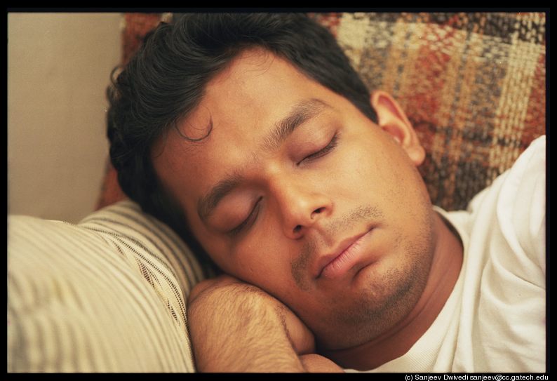 A batchmate from my bachelors'. He came down to visit us and fell asleep while watching television. I was about to go out to my office when I happened to look at him. I stopped my bike, went into my room, brought the whole gear outside and started setting it up right in front of him, at about 1.5ft from him. I thought that all the ruckus would wake him up but apparently he is a heavy sleeper. I did not wish to use flash because that would probably wake him up. The room was not very well lit and hence the yellowish tinge in the picture. Nikkor 105mm/2.8D on a tripod with f/2.8 and probably a 1/4th second exposure.