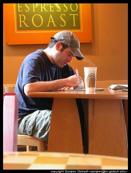 Unknown person at Starbucks, 14th Street, Atlanta, GA. I was waiting for someone down there and this person was just too absorbed in his work. It was his intense concentration that captured my attention. I did not wish to disturb him and hence I took the picture from where I was sitting, without getting up to get a better view. That is why you see the stray table top and side of a chair. Manual mode on a Nikon coolpix 4500 digital camera.